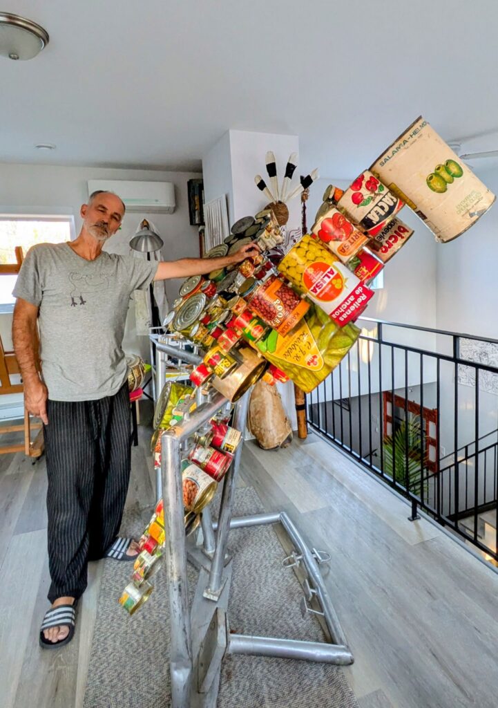 Our upcoming album, The Promise of Chaos, is in production and will be released later this year. The world moves so swiftly these days that my recent precognitive poetry is already more like biting historical commentary. Michel and I are co-composing with a myriad of instruments and digital tools and layers of recordings from decades of improvised music with outstanding musicians. It is a collaborative composition of collage that will celebrate creative outbursts such as Michel’s recycled can sculpture and evocative recordings from, for example, Barre Phillip’s chapel in the Var.
